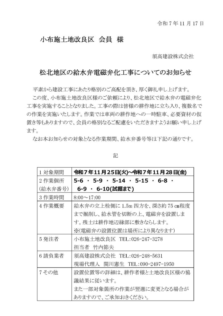 松北地区 給水弁電磁弁化工事実施について(11月25日~28日)