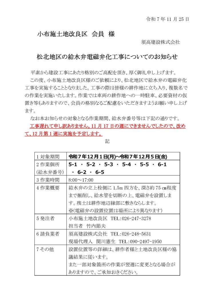 松北地区 給水弁電磁弁化工事実施について(12月1日~5日)