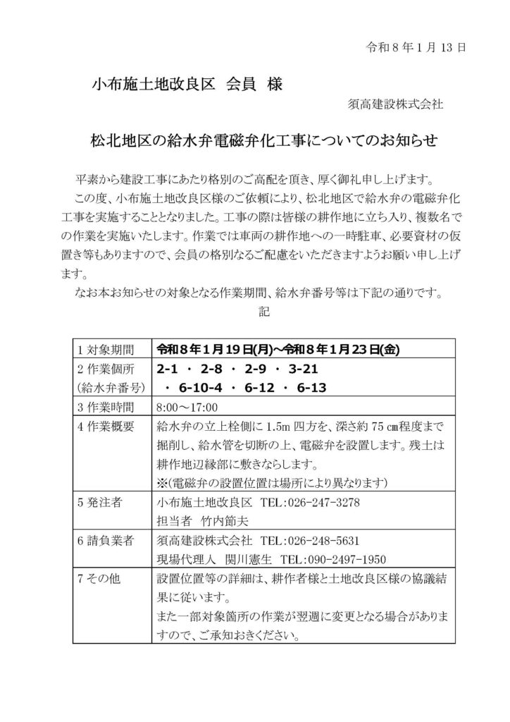 松北地区 給水弁電磁弁化工事実施について(1月13日~16日)