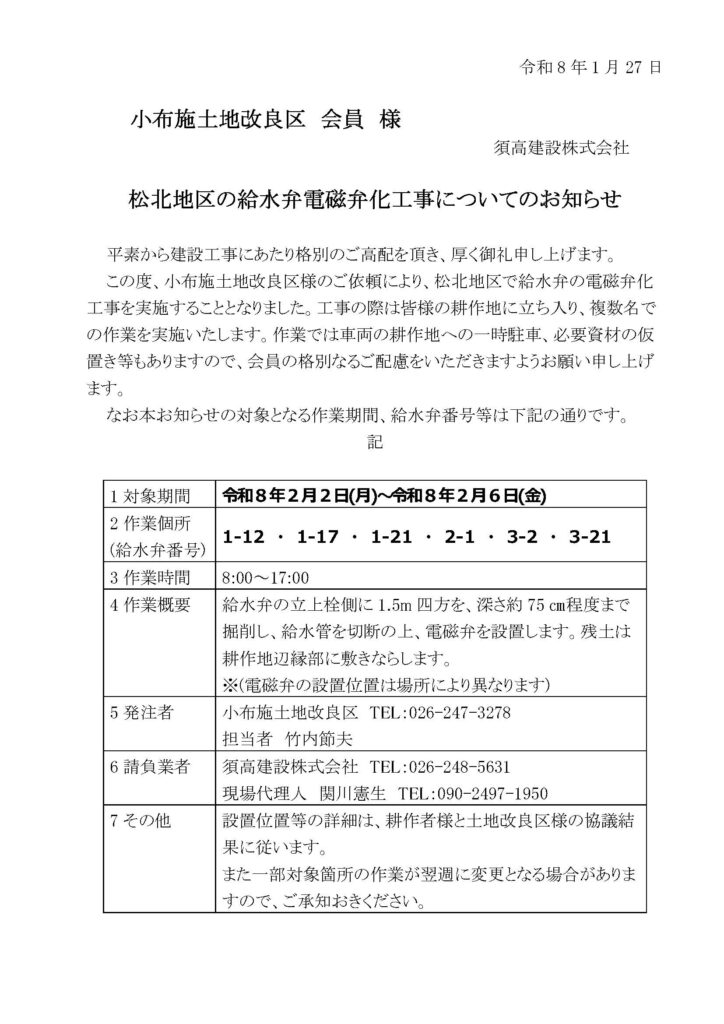 松北地区 給水弁電磁弁化工事実施について(2月2日~6日)