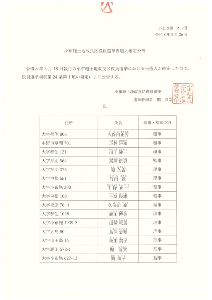 令和8年3月18日執行の小布施土地改良区 役員選挙 当選者が確定したので公告します